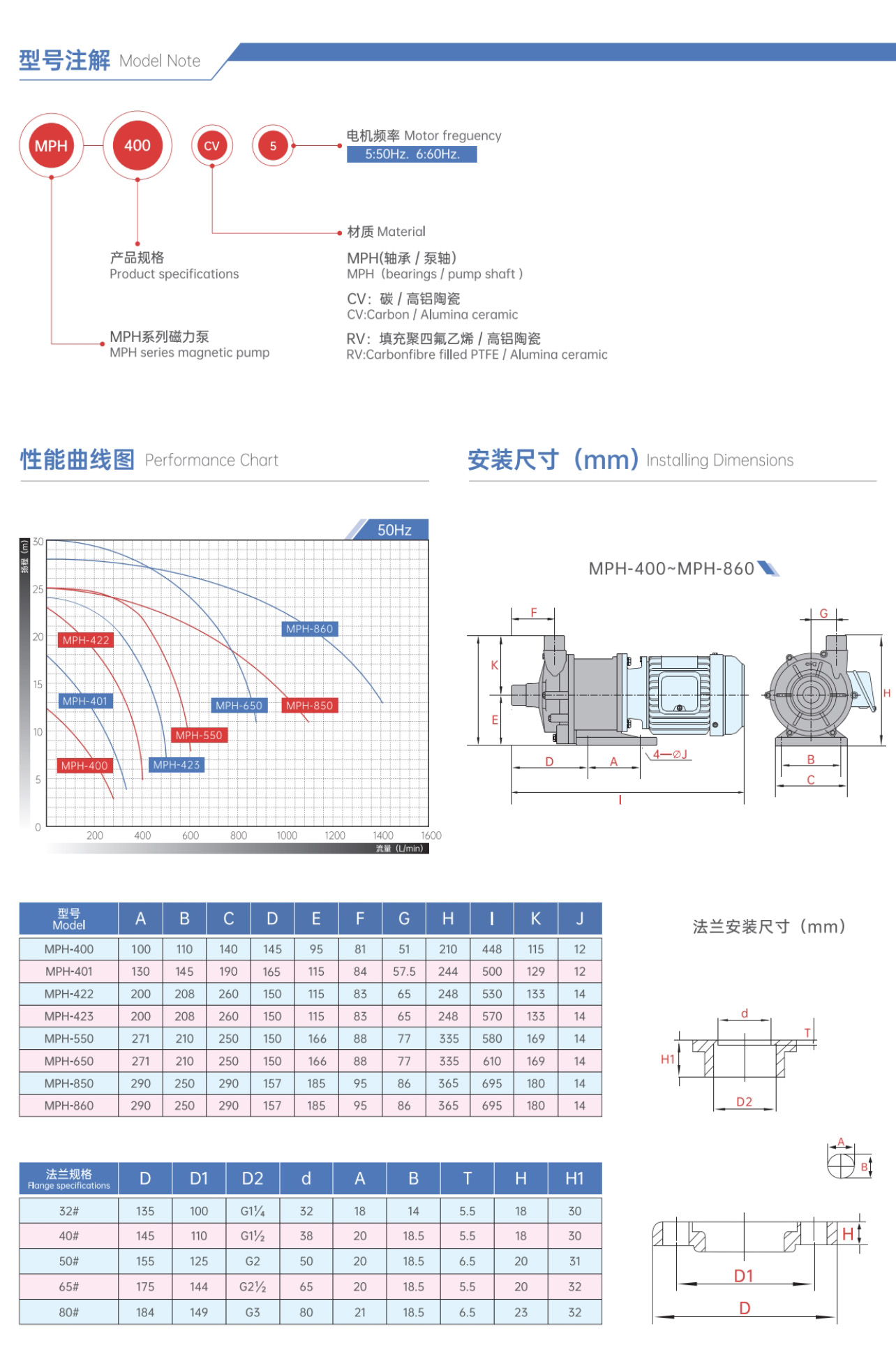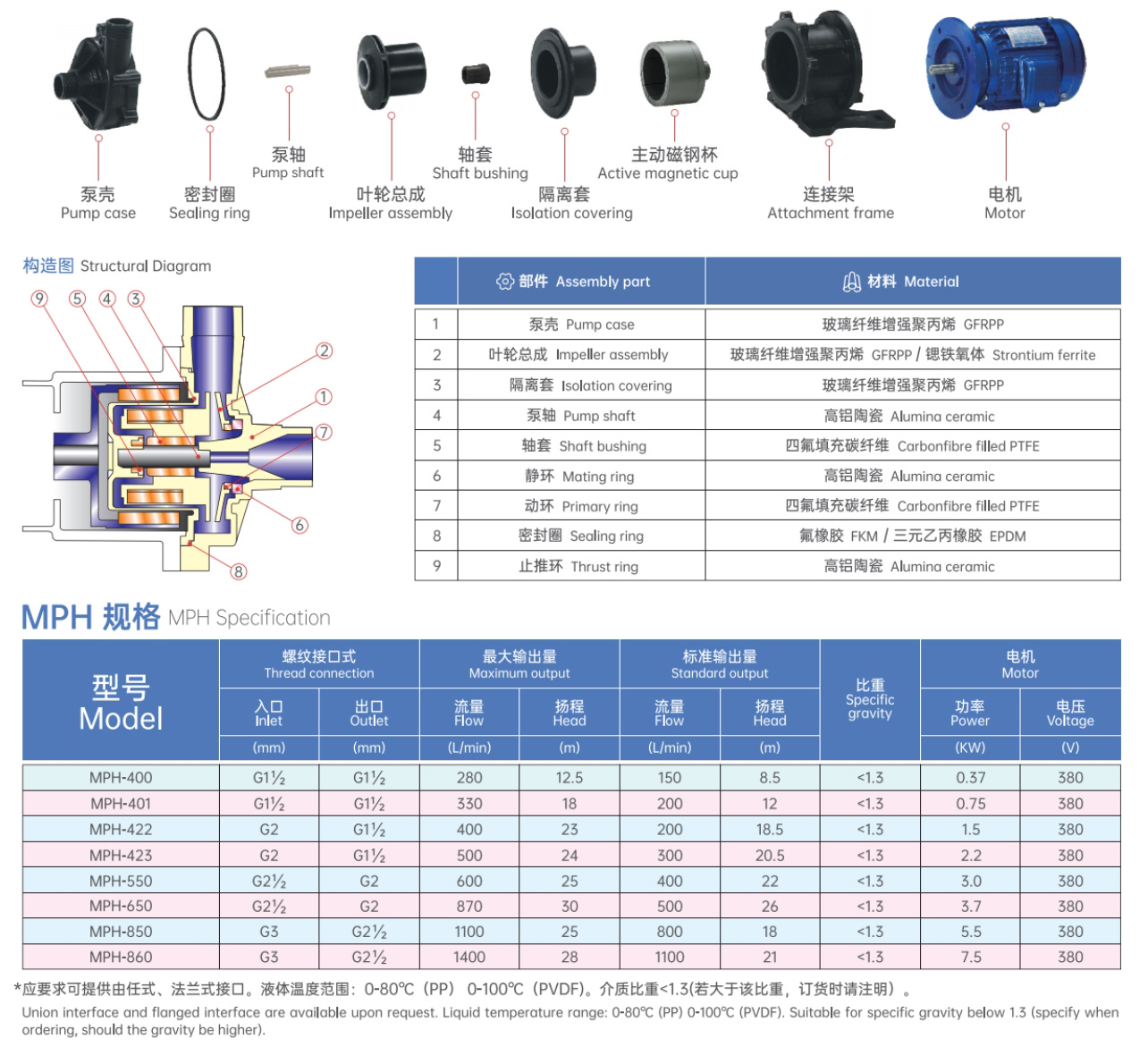 创新的节能设计 MPH系列磁力泵因其创新的节能设计使磁力泵能发挥最大的效能,提高产 品的耐用性。材质GFRPP、适用温度:80℃以下、PVDF适用温度: 100℃以下。