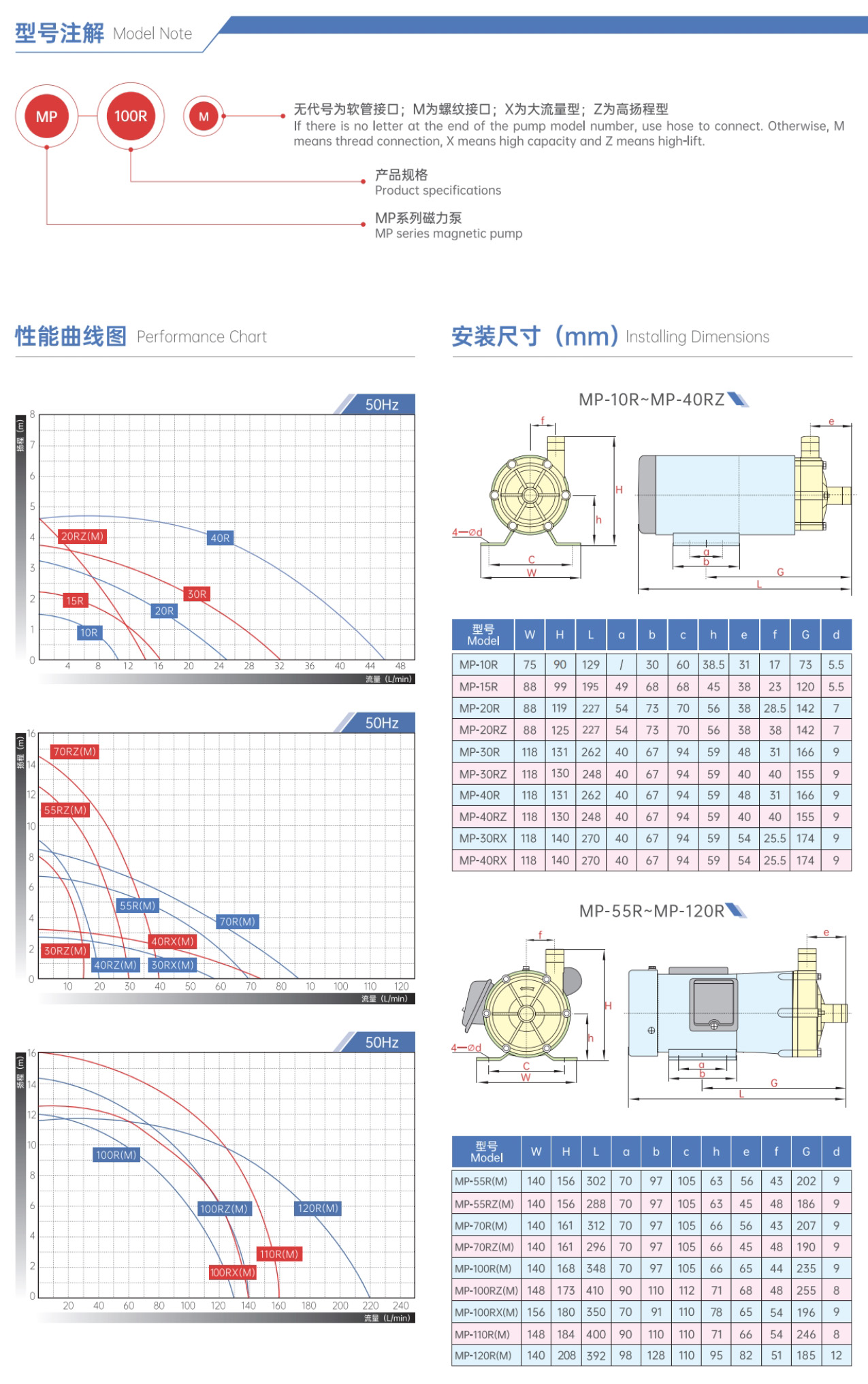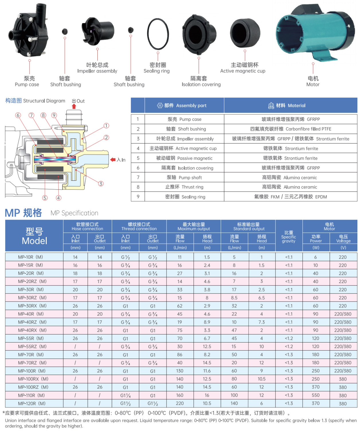 MP系列磁力泵采用无轴封设计,泵体完全密封,绝无泄漏,不会引起 泵体腐蚀及环境污染,是理想的腐蚀性液体输送泵。MP系列最大流量 由每分钟11公升至220公升,有软管接口和螺纹接口选择。泵体材料采 DOR 无代号为软管接口;M为螺纹接口;X为大流量型;Z为高扬程型 用玻璃纤维增强聚丙烯及高铝陶瓷,大部分的化学液体均可安全输送。 泵体组件模块化。使维修保养极为容易。材质GFRPP、适用温度: 80℃以下、PVDF适用温度:100℃以下。